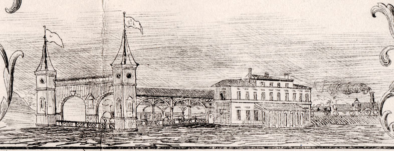 [6] NEUER GRUNDRISS VON HAMBURG Links oben in der Bordüre ist der allererste Bahnhof in Hamburg dargestellt. Die Gleisstrecke wurde erst im selben Jahr (1842) während des Brandes in Betrieb genommen. |